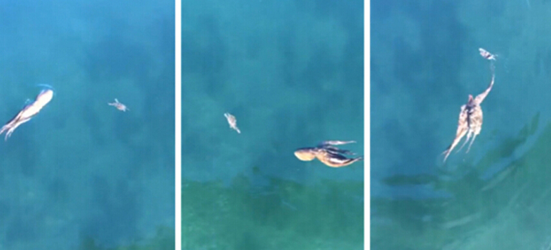 其中一席游客拍摄视频记录下了这一画面。画面中一只体型庞大、看上去非常饥饿的章鱼马力全开,张牙舞爪正在捕捉一只体型比它小很多的小螃蟹。可怜的小螃蟹拼尽全力,落荒而逃。在绕了几圈之后,小螃蟹最终还是没有逃脱章鱼的“魔掌”,不幸被当成了晚餐。(米粒)