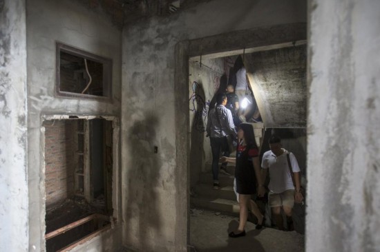 游客走在曼谷的一个废弃的建筑物“Sathorn Unique”内的消防逃生通道。