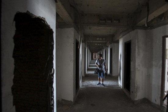 在曼谷废弃的建筑物“Sathorn Unique”内一名参观者在行走。