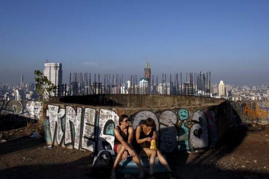 游客坐在曼谷的一座废弃的建筑物“Sathorn Unique”的屋顶上。
