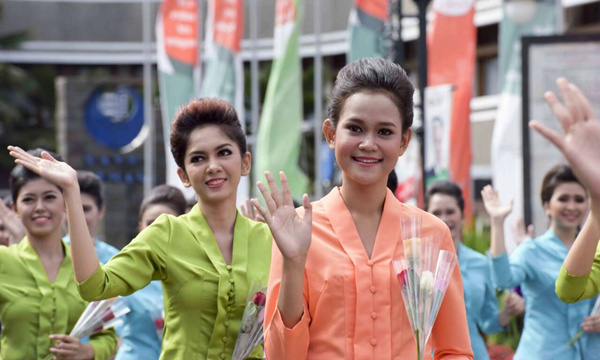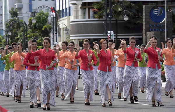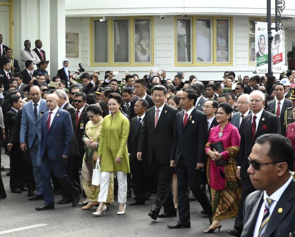 习近平夫妇和印度尼西亚总统佐科夫妇等一道,走在队伍的前列,一边走一边向道路两旁的人群挥手致意。兴高采烈的当地民众和学生簇拥在街道两旁,挥舞着亚非国家的国旗。整座万隆城,一派热烈的节日气氛。