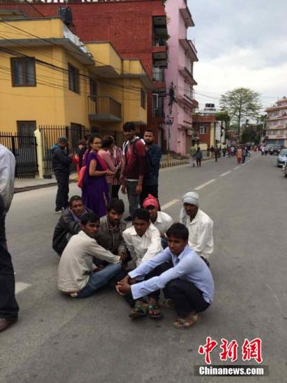 4月25日14时11分在尼泊尔(北纬28.2度,东经84.7度)发生8.1级地震,震源深度20千米。尼泊尔首都加德满都震感强烈。图民众在户外避险。 中新社发 符永康 摄