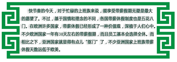 上班族无法全部使用带薪假期的比重韩国高居榜首。有61%的韩国上班族无法休满全部带薪假期。其中,原因主要是与工作冲突,10名上班族族中有6.3人回答曾因工作推迟或取消休假。