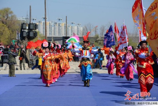 2015年4月25日,在吉林省吉林市乌喇公园,满族艺术团成员现场表演满族秧歌,助阵当日举办的开江鱼美食节。