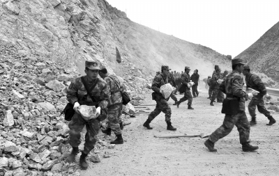 26日凌晨,按照日喀则军分区统一部署安排,驻藏某团出动200余名官兵组成第二梯队,携带40多顶帐篷等救灾器材,冒着暴风雪奔赴樟木地震灾区。