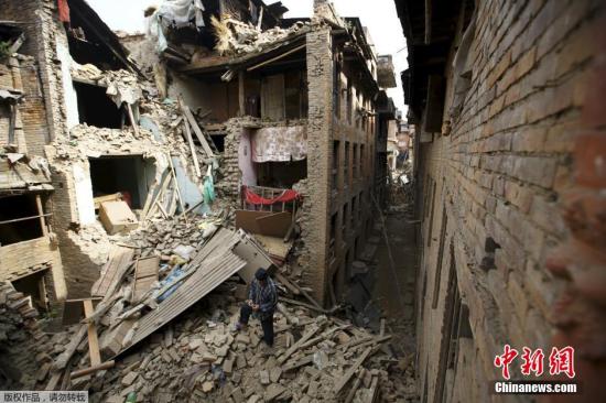 4月25日,尼泊尔发生里氏8.1级地震,首都加德满都大量房屋倒塌,部分道路堵塞中断。图为尼泊尔民众在废墟中寻找亲人。