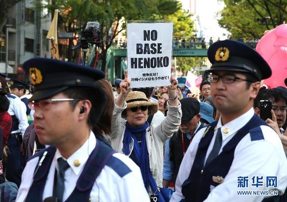 资料图片:4月26日,在日本东京,一名女子在示威游行上举起标语。当日,超过1000名抗议者在日本东京涩谷附近举行示威游行,抗议日本政府在冲绳县边野古地区为驻日美军普天间基地搬迁建设新基地设施。新华社记者 刘天 摄