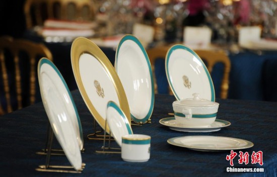 这套餐具将于明天在白宫“首秀”,招待到访的日本首相安倍晋三夫妇。中新社发 张蔚然 摄