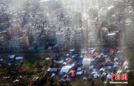 4月27日,从飞机上航拍到的加德满都受灾房屋。4月25日,尼泊尔发生8.1级地震。 中新社发 张浩 摄