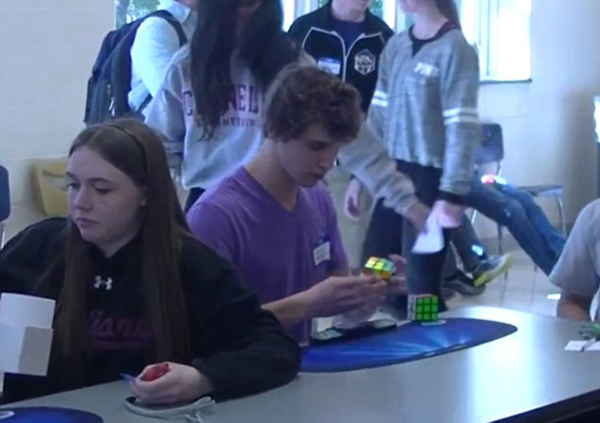 比赛中,伯恩斯精力集中,快速旋转着魔方,旁边的计时器飞速跳动。看到自己创造了新的世界纪录后,伯恩斯的脸上现出笑容。