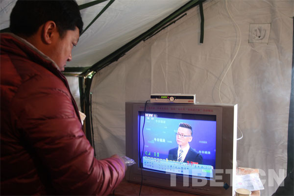 灾区民众在帐篷内可看电视了 摄影:王淑