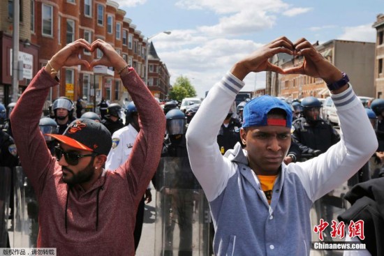 4月29日消息,美国巴尔的摩市数千人参加在被警方拘留期间死亡的25岁黑人男子格雷的葬礼后,该市多个街区爆发骚乱、抢劫和暴力冲突。截至当地时间28日下午,有至少20名警员受伤,超过200人被逮捕,包括30多名未成年人。图为民众在警方面前做出爱心的手势。