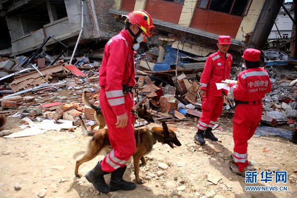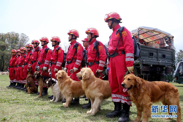 4月29日,中国国际救援队的搜救队员带着搜救犬在营地集结,准备开始当天搜救幸存者的工作。新华社记者白阳摄