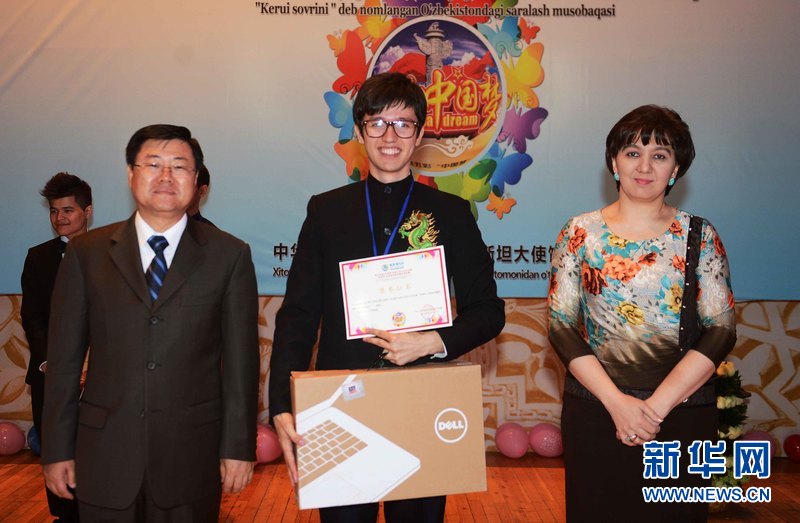 4月28日,在乌内务部文化宫礼堂,来自撒马尔罕国立外国语学院的扎尔卡毛(中文名:康晓鑫)获得特等奖。新华网记者 沙达提摄