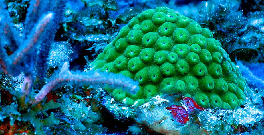 美国国家海洋大气管理局2015年对加勒比海进行了海底测绘,期间“南希·福斯特”号船上的遥控海底车,拍摄了海床之上的景象。在美属维尔京群岛的珊瑚礁中,一小堆珊瑚坐落在珊瑚藻和海绵动物之间。(图片来源:NOAA/美国国家海洋大气管理局)