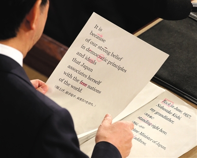 安倍全程用英语演讲 红笔画“重点”
