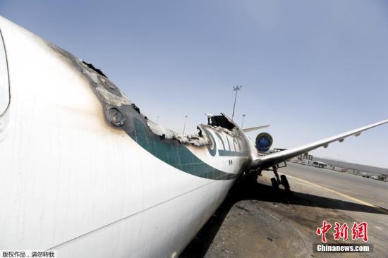 资料图:当地时间2015年4月29日,也门萨那国际机场,一架费利克斯航空公司飞机在空袭中被毁。沙特领导联军28日空袭也门萨那机场跑道,试图阻止伊朗飞机着陆。