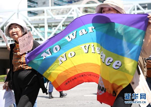 5月3日,在日本横滨,示威者手举“不要战争、不要暴力”的标语,抗议首相安倍晋三企图修改和平宪法。当日是日本第68个宪法纪念日,约三万日本民众在横滨参加保护和平宪法的集会,其中数千人举行了示威游行。 新华社记者刘天摄