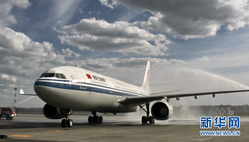 两辆等候在停机坪两侧的消防车向空中喷出水柱,营造出一座弧形水门。陈俊锋摄