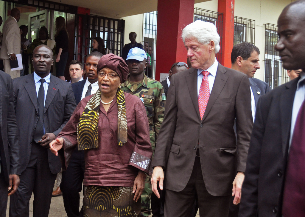 当地时间2015年5月4日,利比亚蒙罗维亚,美国前总统比尔-克林顿访问利比亚,利比亚总统Ellen Johnson Sirleaf陪同。(图片来源:东方IC)
