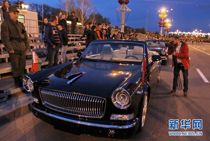 5月4日夜,白俄罗斯举行纪念伟大卫国战争胜利70周年阅兵彩排。中国红旗牌检阅车行驶在白首都明斯克市胜利者大街和马舍洛娃大街的交汇口。据悉,这是红旗检阅车,首次走出国门亮相主权国家重大庆典活动。