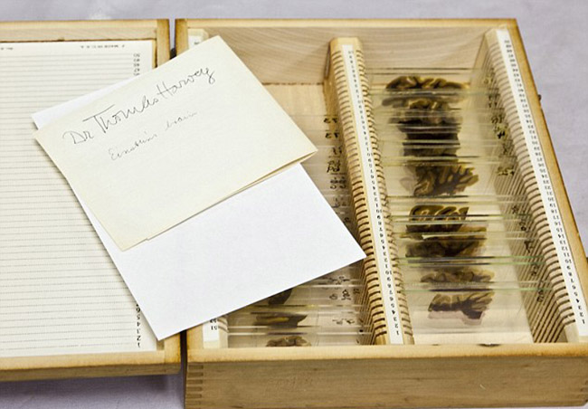 哈维带着爱因斯坦的大脑前往宾夕法尼亚大学,并在那里对大脑进行切片,然后送给了知名神经病理学家。2011年11月,穆特博物馆接到电话,告知其会收到一个哈维制作的盒子。里面有46片显微镜载片,每一片都含有一个大脑切片。时至今日这些载片仍在展出。穆特博物馆馆长、穆特研究所主管安娜·多迪(Anna Dhody)说:“这些载片是唯一公众可以看到的爱因斯坦身体的一部分。”(杨柳)