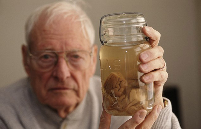 病理学家托马斯·哈维在未经允许的情况下,私自将爱因斯坦的大脑带走进行研究。哈维在2007年去世,曾于1994年被看到保有爱因斯坦的大脑(网页截图)