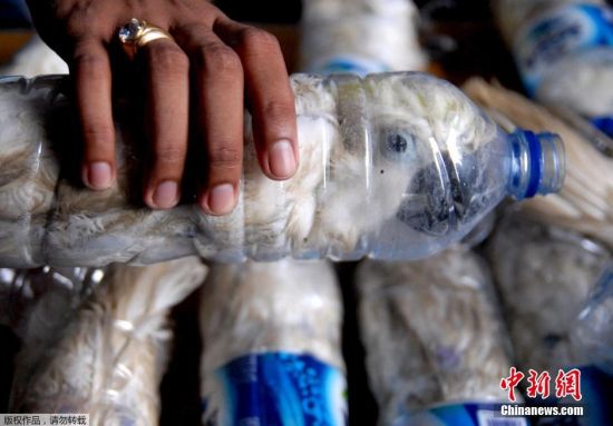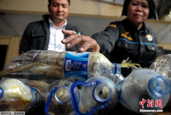 当地时间2015年5月4日,印尼泗水,印尼警方解救了被非法交易的小葵花凤头鹦鹉,这些鹦鹉都被塞在空水瓶里。