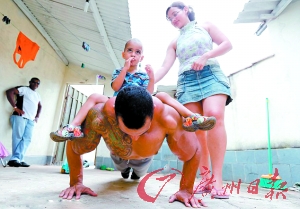 阿尔维斯将儿子背身上做俯卧撑。