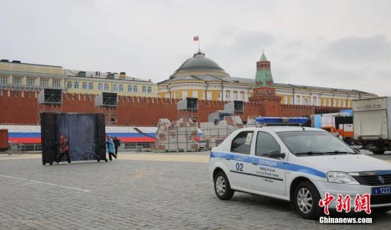 近日,莫斯科红场已被封闭起来筹备胜利日阅兵。红场上停放着警车、工程车、道具等,工作人员穿梭期间。在外围可以听到广场上传出的指挥口令。中新社发 文龙杰 摄
