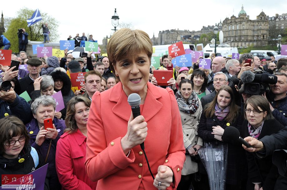 5月6日,在英国爱丁堡,英国苏格兰民族党领袖妮古拉·斯特金(中)在竞选活动中讲话。英国将于7日举行大选,目前各党派已进入选前最后冲刺。近年来,英国政坛出现大党渐衰、小党崛起、选票分散、议程破碎等特点,政治碎片化在今年的大选中尤其明显。新华社/法新