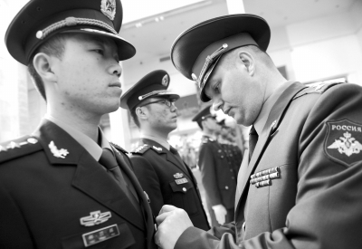 中国人民解放军三军仪仗队士兵接受俄罗斯国防部代表授勋。新华社发