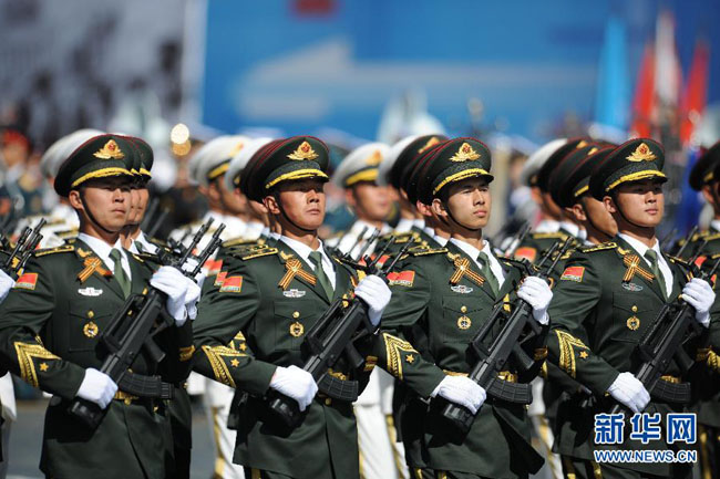 5月7日,在俄罗斯首都莫斯科,中国人民解放军三军仪仗队在彩排中列队行进。当日,俄罗斯在首都莫斯科的红场举行纪念卫国战争胜利70周年红场阅兵式总彩排。 新华社记者 戴天放 摄