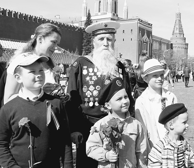 俄罗斯青少年与参加红场阅兵的老战士合影。本报记者 林雪丹摄