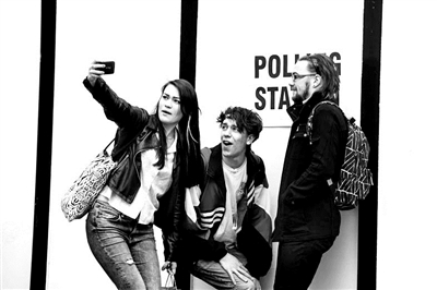 5月7日,英国伦敦,选民在投票站玩自拍 供图/IC