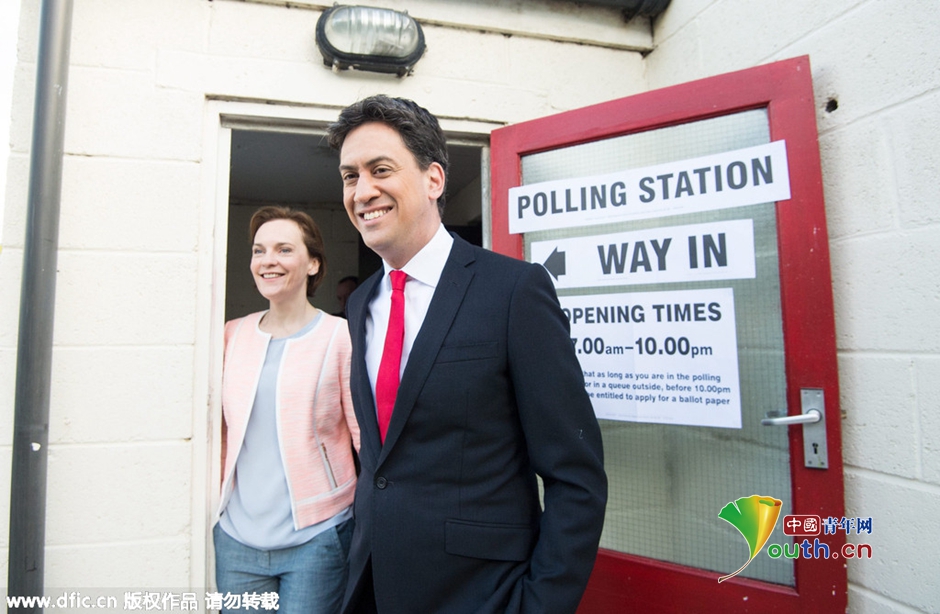 当地时间2015年5月7日,英国顿卡斯特,工党领袖米利班德携妻Justine在投票后离开投票站。5月7日,英国大选正式开始。