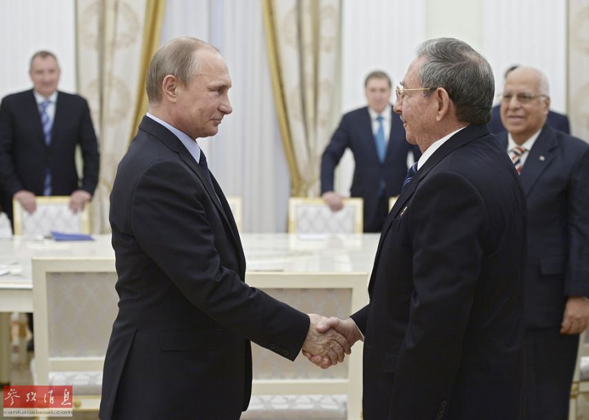 当地时间2015年5月7日,俄罗斯莫斯科,俄罗斯总统普京在克里姆林宫会见古巴领导人劳尔·卡斯特罗。劳尔·卡斯特罗将出席5月9日俄罗斯纪念卫国战争胜利70周年庆典。