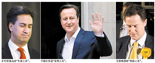 与卡梅伦的欣喜不同,工党党首米利班德和自民党党首克莱格8日宣布引咎辞职。和2010年选举相比,工党丢掉了20多个席位。米利班德在伦敦举行的新闻发布会上说,他将辞去工党党首一职,让更有能力的人领导这一政党。