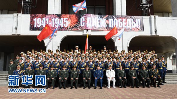 5月9日,在俄罗斯首都莫斯科,中共中央政治局委员、中央军委副主席范长龙(前排左七)与中国人民解放军三军仪仗队合影。受习近平主席委托,中共中央政治局委员、中央军委副主席范长龙9日下午来到参加俄罗斯纪念卫国战争胜利70周年庆典的我军阅兵方队驻地看望官兵,代表习主席和中央军委向方队官兵圆满完成参阅任务表示祝贺,勉励他们认真总结经验,牢记强军目标,献身强军实践,为党和人民再立新功。新华社记者 戴天放 摄