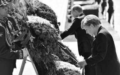 ▲5月10日,在俄罗斯莫斯科,俄罗斯总统普京(后)与德国总理默克尔(前)向无名烈士墓敬献花圈。德国总理默克尔于10日抵达莫斯科进行访问。新华社/法新