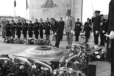 ▼5月8日,在法国巴黎凯旋门,法国总统奥朗德拨旺无名烈士墓的长明火。 新华社/法新