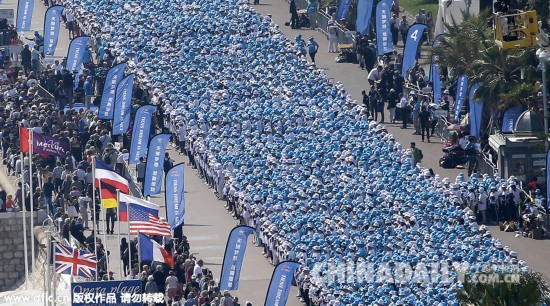 当地时间2015年5月8日,法国尼斯,中国天狮集团庆祝公司20周年纪念日,天狮集团半数员工约6400人获得4天假期,分别在巴黎和尼斯旅游两天。图为公司员工在英国海滨大道庆祝。