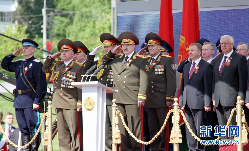白俄罗斯总统卢卡申科同白议会和政府领导人一道参加阅兵式。(新华网记者 陈俊峰 摄)