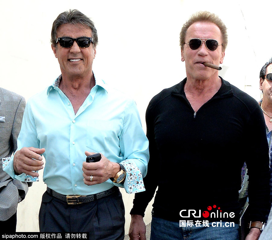 美国洛杉矶当地时间2015年5月9日,史泰龙(Sylvester Stallone)与阿诺德·施瓦辛格(Arnold Schwarzenegger)现身洛杉矶一同用午餐。 图片来源:Sipaphoto