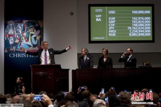 当地时间2015年5月11日,美国纽约,纽约佳士得开拍毕加索完成于1955年的名画《阿尔及尔女人(O版)》,经过激烈竞拍,该幅作品拍得1.793亿美元的高价,远远超过它1.4亿的估价。而这个价格也打破了诸多名画的竞拍记录。