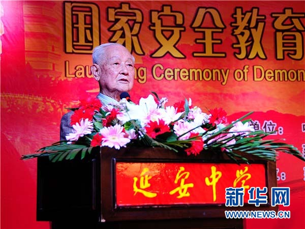 5月12日,中国政策科学研究会国家安全政策委员会副会长、军事科学院原副院长糜振玉,在延安中学“国家安全教育示范基地”启动仪式上致辞。(新华网记者 郝斐然 摄)