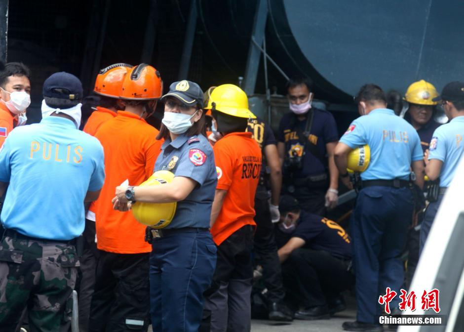 菲律宾首都大马尼拉地区巴伦苏埃拉市一家拖鞋工厂5月13日发生大火,截至14日下午,已证实有72人在火灾中遇难。菲律宾内政部长罗哈斯表示,由于仍有人员失踪,遇难人数可能还会增加。图为14日中午一名女警在救援现场,她的身后救援人员正在检查从火灾现场搬出的遇难者遗体。中新社发 张明 摄