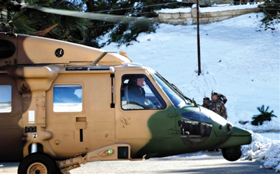 约旦王室2013年11月公布的一张照片中,约旦国王驾驶直升机为遭受暴风雪的民众发放物资。