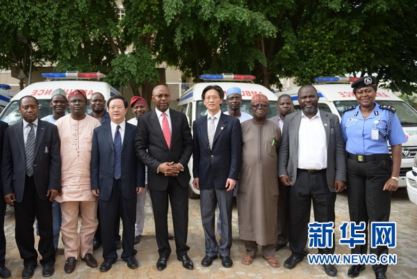 中国驻尼日利亚大使顾小杰(右六)、尼日利亚卫生部常务秘书利努斯·阿乌特(左七)、尼日利亚疾病控制中心主任阿卜杜萨拉米·纳斯迪(右四)、中国驻尼日利亚大使馆经商处参赞周善青(左五)等出席捐赠仪式。(记者杨旸 摄)