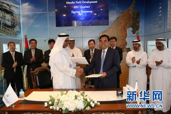 2015年5月17日,中国石油工程建设公司(CPECC)与阿布扎比陆上石油公司(ADCO)3.3亿美元油田开发项目签字仪式在阿布扎比陆上石油公司总部举行,CPECC总经理侯浩杰(前右)与ADCO执行总裁肯迪(前左)交换签字文本。新华社记者安江 摄